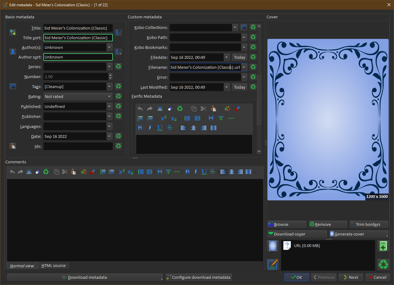 Simply, I have too many large audio files to store in Calibre due to storage & backup issues and nothing to do with Calibre's ability. I'd love to use just Calibre, even on portable storage, but for my uses and situation it doesn't yet work out best. I tried. If the time comes, it's a relatively easy changeover although a bit time consuming if important enough. So, my streamlining project for various audio & other (some associated with books and many not) gets done in batches resulting in hundreds of zip files created at a time based on folder content and using the same naming structure. These are then stored away and easily found or updated when needed. I know what I have based on cataloging them in Calibre. The trick is how to get in the info into Calibre without individual entry. This is akin to transferring records of your entire massive print library into Calibre. So: 1) Given the number of entries, it is a waste of time to enter one by one. I've already spent the necessary time on creating the folders which become zips. This step is required for my purposes. 2) Since my zip format matches by preferred format for book imports to autofill author, series, and title, I just needed to get the info quickly into Calibre without actually bringing in the zip. For a time, creating the shortcut .lnk for the zips worked since it came in as a .lnk file which I then batch deleted leaving the empty entries. I apply my custom tags column for management/info and then I'd run file duplicated to combine any for which there is an already an associated entry (book and/or metadata etnry previously created). 3) I create the shortcuts in a directory, separate the zips to their storage location, then run a rename in command prompt: Ren *.lnk *.entries or whatever I feel like using as it's temporary anyhow. This step takes 30 seconds max. 4) Simply drop them all into Calibre, add my management tags (I call the column Meta), and proceed to clean it up from there with a series of already saved commands in bulk metadata edit such as Search and Replace with REMOVE ".zip - Shortcut" from file names as it imports with that. There are other things I add in bulk from the file name to my Meta mgmt tags before easily cleaning up the file names. Then it's on to duplicate management. Examples of audiobooks, lectures, and various: Biology 1 -Chapter 8- Microbiology LECTURE(mp3-1).zip - Shortcut.lnk Jane Doe -Quantum Mechanics Seminar 1- Quirky Quarks (mp3-m).zip - Shortcut.lnk Physics -Chapter 10.3- Dynamics efinitions & Applications LECTURE (mp3-m).zip - Shortcut.lnkPhysics -Chapter 10.3- Teaching Resources.zip - Shortcut.lnk Physics -Chapter 10.4- Dynamics:Measurement & Error LECTURE (mp3-1).zip - Shortcut.lnk J.R. Tolkien -Lords of the Rings 1- Fellowship of the Ring(m4b)(NOchpt).zip - Shortcut.lnk Jane Austen - Pride and Prejudice (m4b)(chpt).zip - Shortcut.lnk Lee Child -Jack Reacher 01- The Killing Floor (mp3)(chpt).zip - Shortcut.lnk I can store everything together and easily get to it when needed. I can keep track of it all in Calibre. I can quickly add these to Calibre entries and manage easily from there. Truly, Calibre is a brilliant program. It allows basic use to power user and everything in between. Last edited by jecilop; 09-21-2022 at 04:28 PM. Reason: typo |