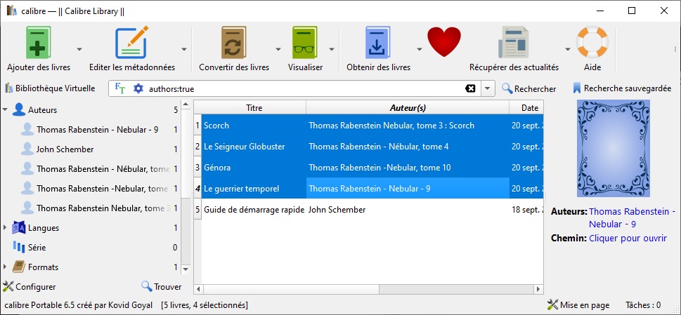 Je vais partir d'un exemple concret (Capture 1) avec 2 auteurs : Robin Hobb et Victor Hugo. Plusieurs possibilités 1 - Renommer l'auteur dans le volet latéral gauche : click droit sur l'auteur (capture 2) 2 - Sélectionner les livres d'un auteur -> click droit -> Editer les métadonnées par lot -> renseigner l'auteur -> OK (captures 3 et 4) 3 - Utiliser les expressions régulières : voir le tuto en français http://tutocalibre.free.fr/tuto_harmonisation.php 3.1 - Remplacer Hobb,Robin et Hugo,Victor par Hobb, Robin et Hugo, Victor (ajout d'un blanc après la virgule) Mettre dans la barre de recherche author: "," AND not author:"~(.*) (.*)" (capture 5) puis Rechercher (capture 6) Sélectionner tous les livres obtenus -> click droit -> Editer les métadonnées par lot (capture 7) Onglet 'Rechercher et remplacer' Dans 'type de recherche' sélectionner 'Expression régulière' Champ de recherche : authors Rechercher : (.*),(.*) Remplacer par : \1, \2 Champ de destination : authors (capture 8). Bien respecter la syntaxe dans les champs Rechercher et Remplacer par. A noter que le résultat obtenu est prévisualisé dans la colonne 'Tester le résultat' OK => repmlacement effectué (capture 9) 3.2 - Remplacer Hobb, Robin et Hugo, Victor par Robin Hobb et Victor Hugo Même principe que précédemment avec : Mettre dans la barre de recherche author: authors:", " (capture 10) et dans l'onglet 'Rechercher et remplacer' Rechercher : (.*),(.*) Remplacer par : \2 \1 (capture 11) Ok => (capture 12) De nombreux autres exemples d'harmonisation de la bibliothèque sont décrites dans le tuto 4 - Ajustement dans le volet latéral gauche L'affichage par défaut est par (prénom nom) des auteurs triés sur le nom. On peut préférer un affichage par clé de tri des auteurs (nom, prénom). Pour ce faire : icône 'Préférences' -> Ajustements (capture 13) Comme proposé remplacer categories_use_field_for_author_name = 'author' par categories_use_field_for_author_name = 'author_sort' Click sur 'appliquer les changements à cet ajustement' -> Appliquer -> Redémarrer Calibre (capture 14) Résultat obtenu (capture 15) |