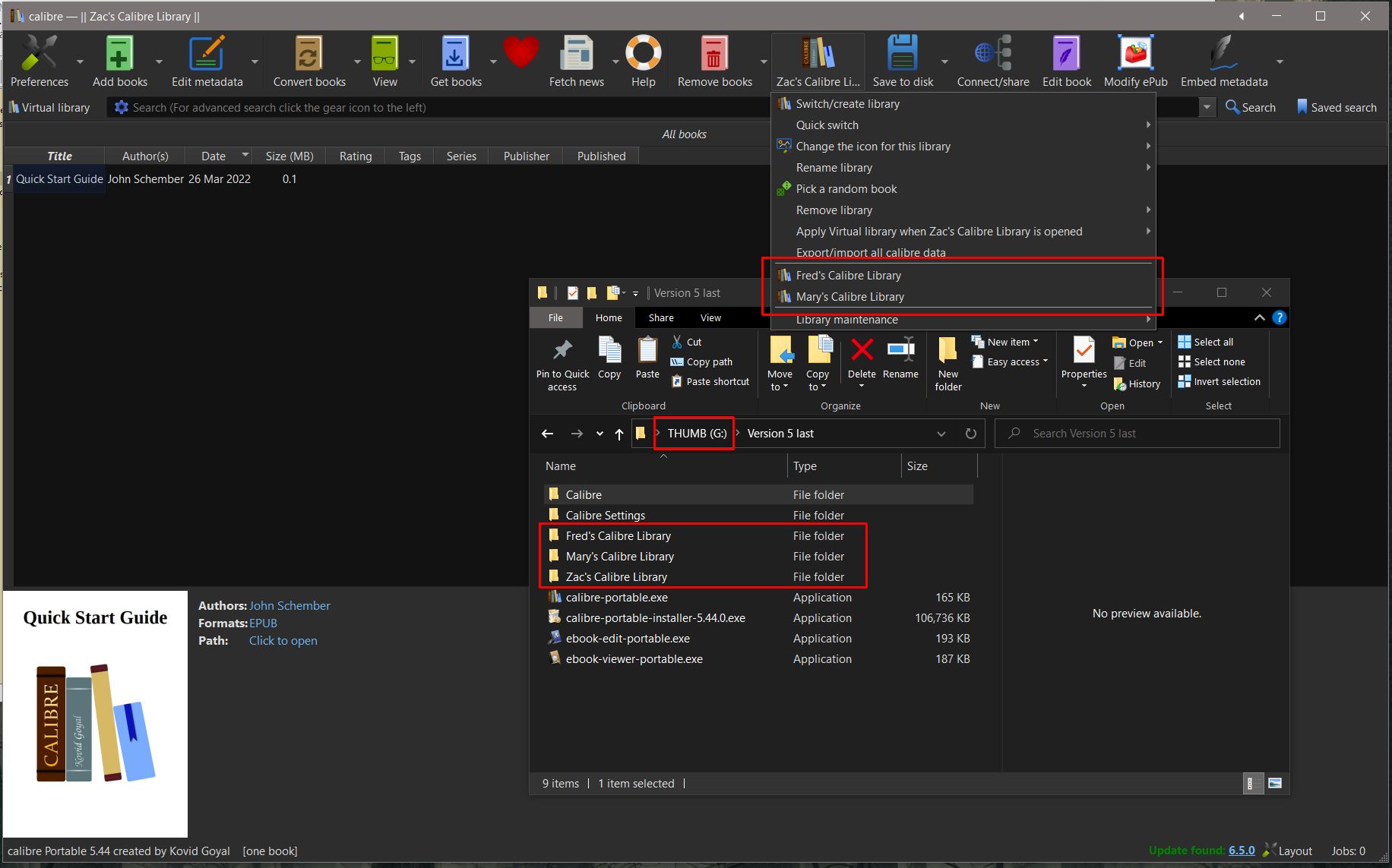 See the attached image, I could post that THUMB drive to you and you'd be able to fire up its copy of calibre portable and access Fred, Mary and Zac's Libraries with my settings and plugins. BR |