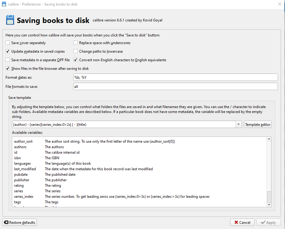 It is setup like this: {series}{series_index:0>2s| | - }{title} - {author} to have this results: Detective 03 - Who shot john - Bill Smith But now it comes out: Who shot john - Bill Smith I changed from vs 6.4 to 6.5 and then 6.61 but now have uninstalled everything and reinstalled 6.4. When I send to kindle and it saves to the calibre library they use book name then author Thanks for your help Fred |