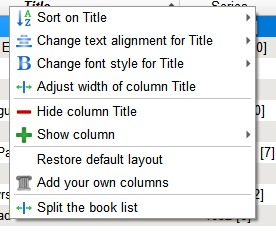 So, I tried to put the Adjust option into my Favourites menu -- I couldn't. My right index finger is trained to navigate context menus with the arrow keys until it gets to the option I want before it needs to press the enter key. And I couldn't give the Adjust option a keyboard shortcut either. Curious to know why the Book list header menu options list (Sort…, Adjust…, Add… etc) doesn't act as a submenu. And whether that could be changed. I tried the Adjust width feature on a 'long' text column with HTML formatting, and on a column that only has an icon - both good ![]() That said, for me, having this in the context menu is a darn sight better than right clicking the header. Thanks chaley and un_pogaz. BR Last edited by BetterRed; 10-14-2022 at 04:08 AM. |
