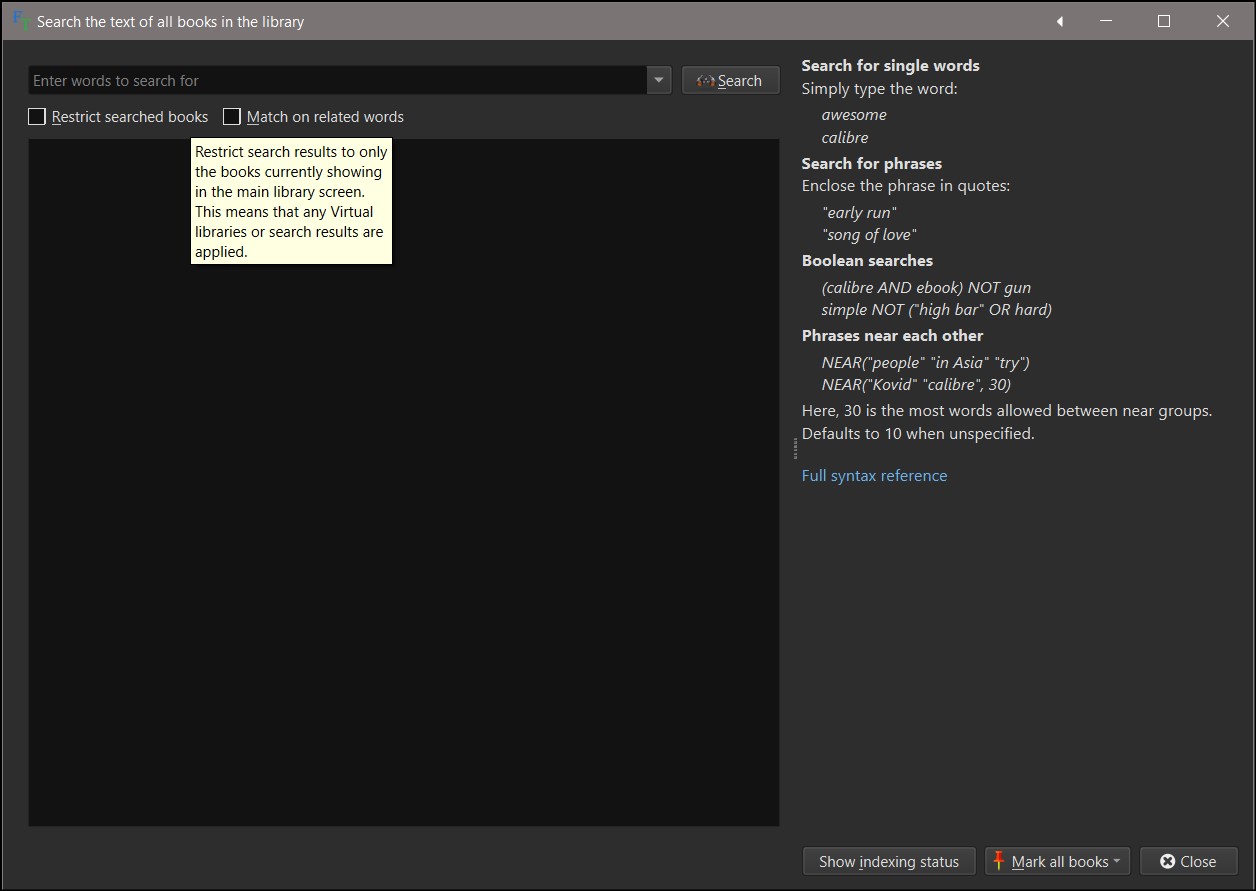 I'd like to do the FTS on a limited number of books. I thought I could just 'temporarily mark' the desired books with ctrl-m, but this doesn't seem to work. In general, what's the best way to use the 'Restrict Searched Books' option in FTS?