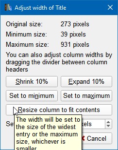 So, I tried to put the Adjust option into my Favourites menu -- I couldn't. My right index finger is trained to navigate context menus with the arrow keys until it gets to the option I want before it needs to press the enter key. And I couldn't give the Adjust option a keyboard shortcut either. Curious to know why the Book list header menu options list (Sort…, Adjust…, Add… etc) doesn't act as a submenu. And whether that could be changed. I tried the Adjust width feature on a 'long' text column with HTML formatting, and on a column that only has an icon - both good ![]() That said, for me, having this in the context menu is a darn sight better than right clicking the header. Thanks chaley and un_pogaz. BR Last edited by BetterRed; 10-14-2022 at 04:08 AM. |