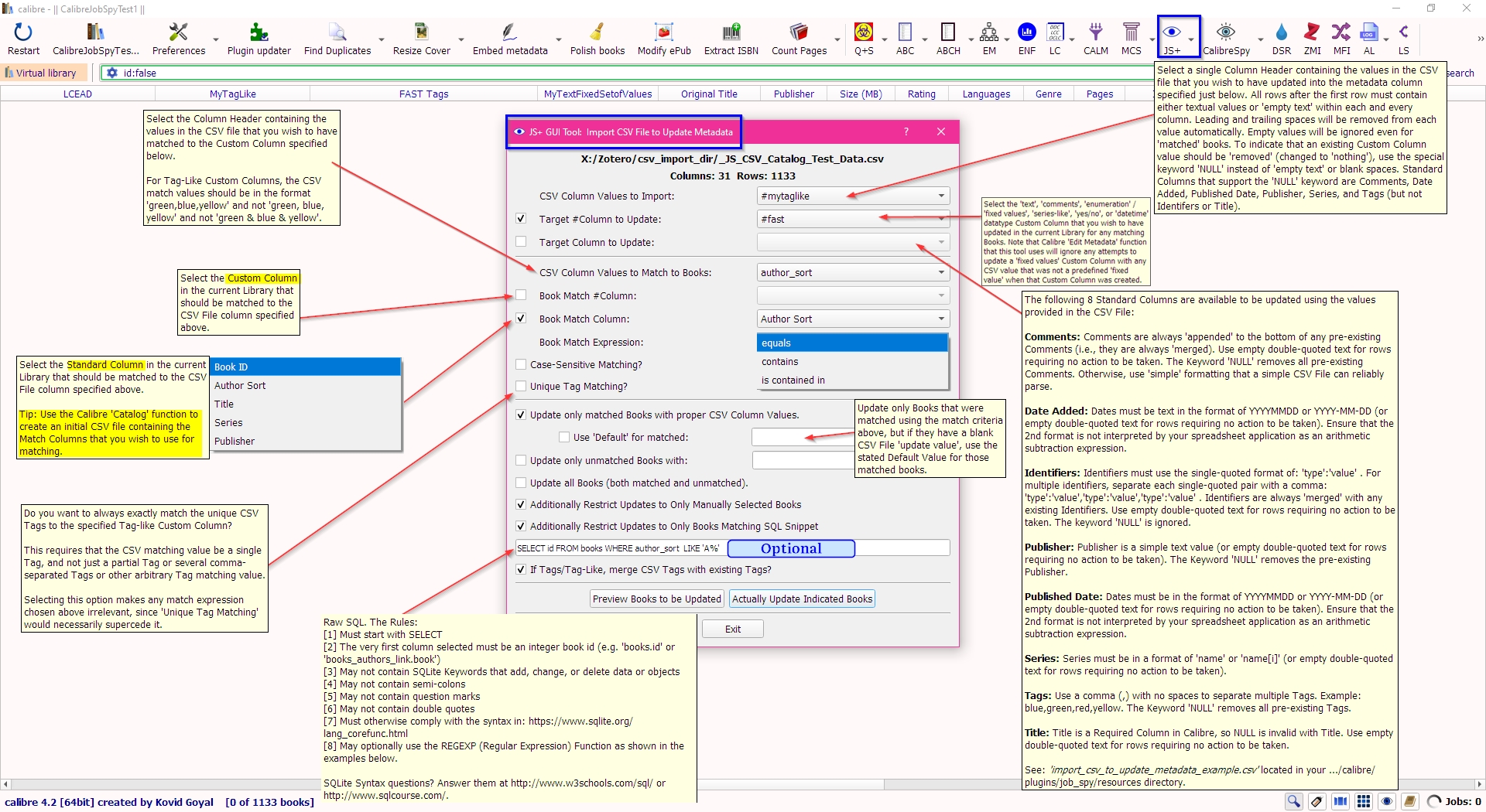 [15] Update all matched books for that first custom column, and then repeat the process by only changing the "source" and "target" .csv columns for the other custom columns. Always execute in "Preview" before doing it for real. No need to reimport the .csv file unless you need to make changes to it in Calc/Excel. Remember to save the .csv as a UTF-8 file when saving the file as a .csv (e.g. Save Filter option in Calc).