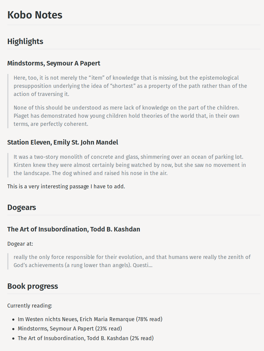 ![]() I get a file like the made with the first version, with all the highlights, and all the dogears than in the first version, with the same order too. And now (I don't know why) I have a "new" dogear that was in a PDF file, that did not appear in the first version!! And I get too the new improvements: the chapters, the date and hour of the highlights, the icons for the highlights and dogears. I think that I have all of them!! Attached you can see a screenshot of part of the new file, that I convert to html with pandoc, in Debian linux. You can see in it the new dogear from the pdf file. Many thanks for all the work. It may be useful. Greetings. Mtxo. |