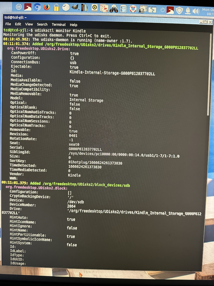 tcd@tcd-yjl:~$ udisksctl monitor Kindle