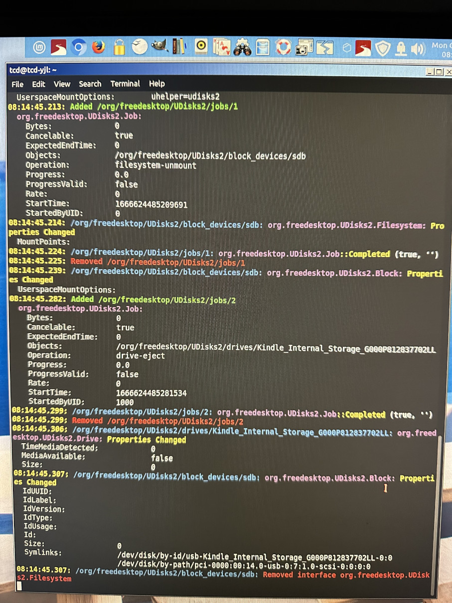 tcd@tcd-yjl:~$ udisksctl monitor Kindle