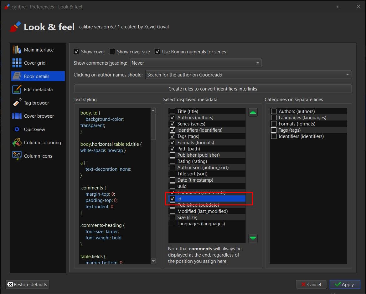 You can show it in the Book Details panel (embedded or detached) by checking the 'id' column in Preferences->Look & feel->Book details, viz: If you want to see it in the book list you have to create a custom 'composite' column with {id} in the template, viz: FWIW: because I find having an id/id column and an Ids/identifiers column confusing, I have a Book Number/#booknumber column in all my libraries. You can't change the id/id column BR |