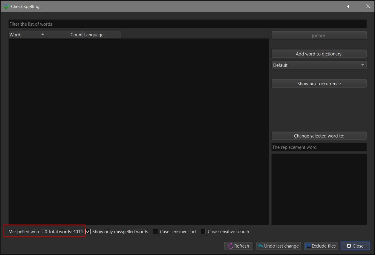 If it is, go to Edit->Preferences->Editor settings->Manage spelling dictionaries. If you get this: …then ot would seem you have 'lost' the default English and Spanish spelling dictionaries. Simplest way to get them back is to reinstall calibre - that means an uninstall and new install - you wont lose any libraries or preference settings in doing that. Which operating system do you use - Windows, Linux or MacOS? BR |