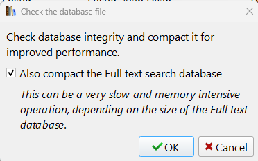 In my experience since Kovid added full text indexing, newly imported or books moved between libraries will require indexing but the remainder of the library will not. For example, about 15 minutes ago, I moved 20 books from my intake library to my main library. Showing indexing status showed 13754 of 13772 books indexed and a couple of minutes later, it showed all book files indexed. You will eventually need to vacuum the FTS index files to clean moved/deleted book information but this is more or less standard for databases. To do this check the Also compact the Full text search database option in the Library maintenance/Check the database file popup. Edit: added image of the popup Last edited by DNSB; 11-12-2022 at 05:45 PM. Reason: added image of the popup |