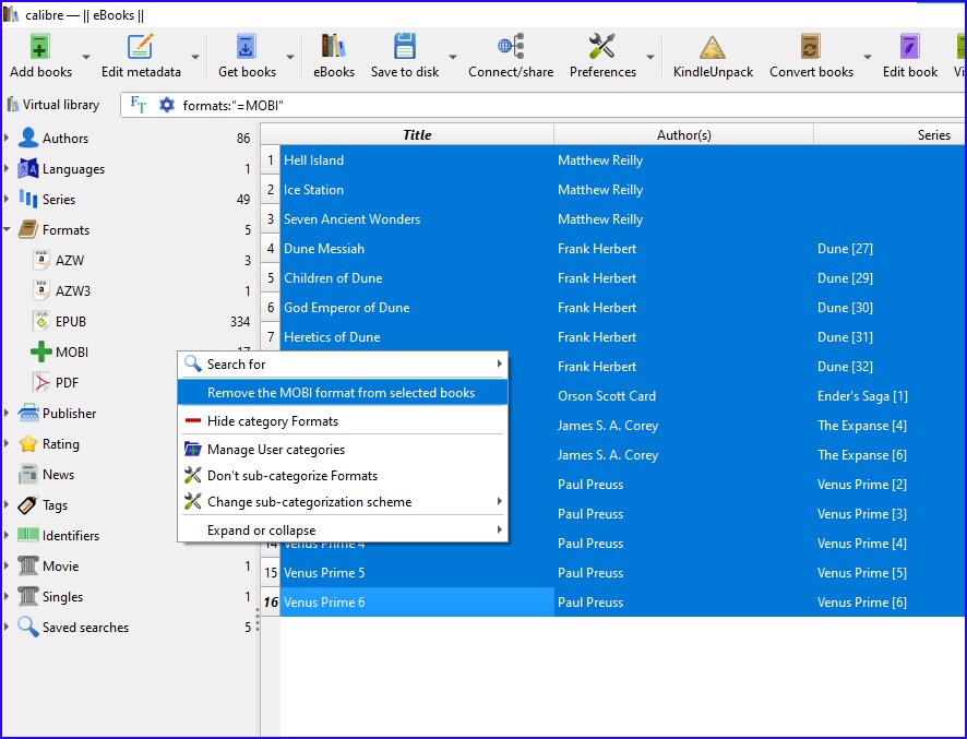 It there a way to select a whole bunch of books and delete the mobi format from all of them at one time? I am doing this but I have to go through each book one at a time. |