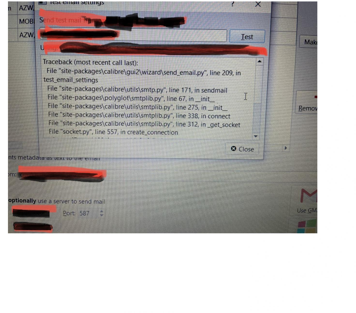 Hi all was advised to use GMX to send books to kindle via calibre after my previous email stopped working.This worked fine but that GMX address has been blocked for some reason.I have opened up another account but when trying to send with new account I'm getting these errors.Can anyone help ??