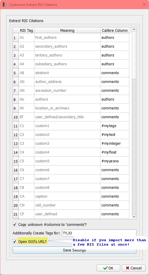 Major new feature: a selection dialog within which you may select/deselect any new RIS custom column choices so you do not have to create all 55 of the possible Tag-to-Custom Column mappings. The default for missing custom columns is the standard Calibre "Comments" column, so their values will go there if they have no specific target to go to. see: https://www.mobileread.com/forums/sh...5&postcount=24 DaltonST |