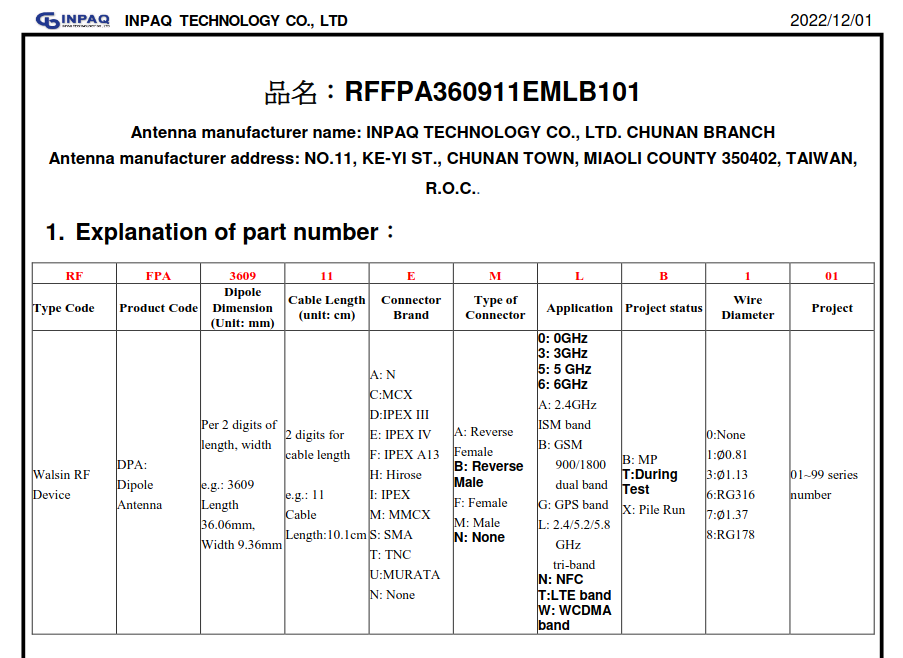 From what I've seen in Walsin datasheets, that antenna would be a 2.4GHz/5.2GHz/5.8GHz Wifi tri-band/BT unit. Actually, if you refer to the part number segmented above the table, the L for antenna type that would appear to exactly that. So it's 36.09x9.36mm with a 10.1cm connecting cable ending in an IPEX IV micro-co-axial male connector specced for WiFi/BT triband.