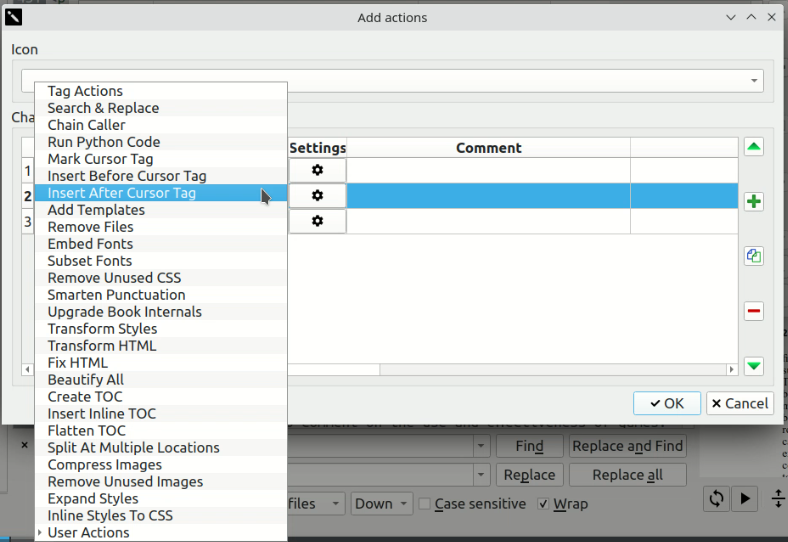For people familiar with the Action Chains plugin, this is a similar plugin for the calibre editor. It allows the user to chain multiple actions and run them together.