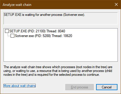 A few times I've had issues with the generic InstallShield (used to swap out 16-bit stub installers on older games) getting stuck in the background until I close seemingly random programs such as Scrivener. Last edited by ownedbycats; 12-26-2022 at 06:20 AM. |