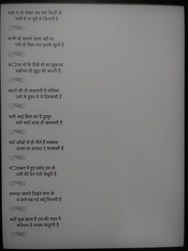 Anyway, everything seems to work as it should. When I synchronized Pocket, it said it would need to download a font for missing glyphs, and it downloaded Noto Serif Devanagari. The article I'd saved then displayed text in Hindi, which seemed to my inexpert eyes be the same as in the original. See screenshot below, and the original page (it was the top news story on BBC Hindi at the time). [EDIT] OK, a bit of searching revealed a whole bunch of free books in Hindi on the Kobo store. I got the one with the most intriguing cover, which turned out to be a book of short poems / couplets (I think). It displays fine on the Kobo Web reader (see attached image). On my Aura One, however, things are a bit weird. When I use Noto Serif Devanagari as a supplemental font and 'Publisher Default' as the main font, then a few glyphs aren't displayed. The attachment "devanagari-test-kao-1.jpg" is quite representative of what a typical page looks like. However, when I set Noto Serif Devanagari to be the main font, then everything seems to display correctly (see "devanagari-test-kao-2.jpg"). From what I can tell (but do remember that this isn't actually a language I can read), the issue seems to relate to combining marks. Comparing the two versions, the first missing glyph seems to be U+093C DEVANAGARI SIGN NUKTA, while the second seems to be U+0941 DEVANAGARI VOWEL SIGN U. I don't know if every instance of these signs fails to render properly, or if there's something about this particular combination that is causing the problem. But, in any event, everything seems to display fine if I set Noto Serif Devanagari as the main font, and I'm definitely not seeing the issues you saw with your book where Devanagari text displays as English letters. Last edited by lensmann; 12-27-2022 at 08:31 PM. Reason: Added information about Kobo Hindi books |