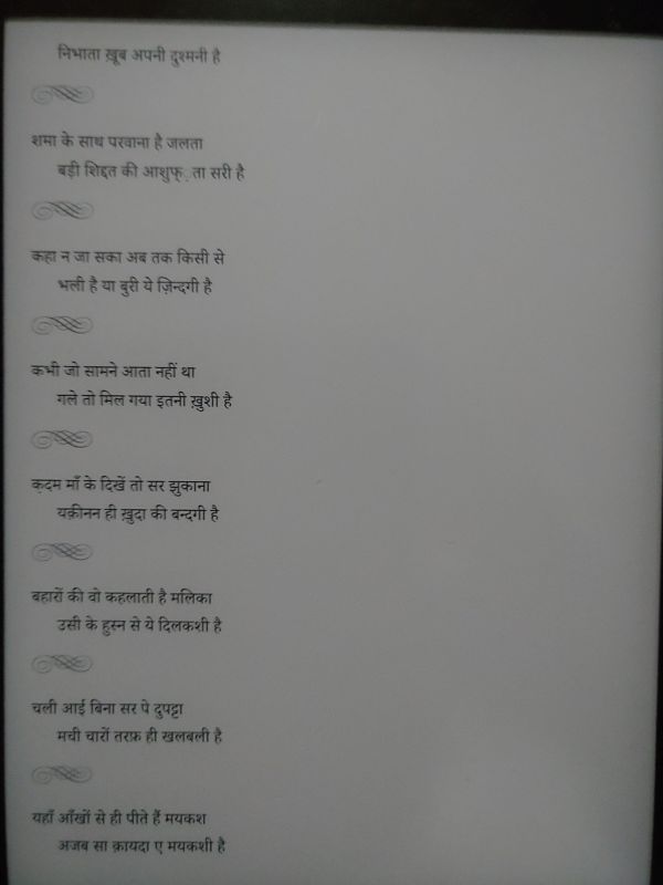 Anyway, everything seems to work as it should. When I synchronized Pocket, it said it would need to download a font for missing glyphs, and it downloaded Noto Serif Devanagari. The article I'd saved then displayed text in Hindi, which seemed to my inexpert eyes be the same as in the original. See screenshot below, and the original page (it was the top news story on BBC Hindi at the time). [EDIT] OK, a bit of searching revealed a whole bunch of free books in Hindi on the Kobo store. I got the one with the most intriguing cover, which turned out to be a book of short poems / couplets (I think). It displays fine on the Kobo Web reader (see attached image). On my Aura One, however, things are a bit weird. When I use Noto Serif Devanagari as a supplemental font and 'Publisher Default' as the main font, then a few glyphs aren't displayed. The attachment "devanagari-test-kao-1.jpg" is quite representative of what a typical page looks like. However, when I set Noto Serif Devanagari to be the main font, then everything seems to display correctly (see "devanagari-test-kao-2.jpg"). From what I can tell (but do remember that this isn't actually a language I can read), the issue seems to relate to combining marks. Comparing the two versions, the first missing glyph seems to be U+093C DEVANAGARI SIGN NUKTA, while the second seems to be U+0941 DEVANAGARI VOWEL SIGN U. I don't know if every instance of these signs fails to render properly, or if there's something about this particular combination that is causing the problem. But, in any event, everything seems to display fine if I set Noto Serif Devanagari as the main font, and I'm definitely not seeing the issues you saw with your book where Devanagari text displays as English letters. Last edited by lensmann; 12-27-2022 at 08:31 PM. Reason: Added information about Kobo Hindi books |