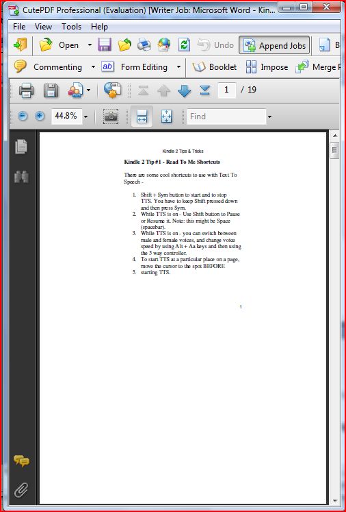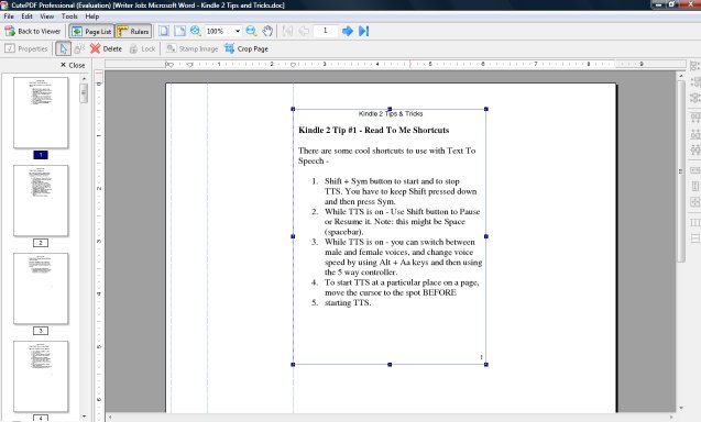 I copy and pasted the text into a Word Document. I set the page size to 4.5 inches by 5.75 inches. I added a header and page numbers (just because I could). I also used hard page breaks to get each tip on its own page (unless it was very short and then I'd put 2 on a page). The font was TimesNew Roman at 12pts. First I tried running the Word file the MPC but wasn't happy with the results, so I decided to use PDFRead after creating a PDF file with CutePDF Pro 3.6 (the free version) using the same page dimension (4.5 inches by 5.75 inches). I've been using this software for years but never explored all the features available even in the free version. The results were a pages sized to fit my Kindle but with a huge white border around it. I used the advanced crop tools to create a rectangle around the text on the first page that would be big enough to work for all pages in the PDF. Having that page number at the bottom of the page helped me to make the correct size rectangle. I now had a PDF with a very small border (there is a watermark at the bottom of the first page only which covers the page number - hey, for free what do you want). I ran that PDF through PDFRead and got a nice sized and very readable pdf. Edit: As I play more, it looks like this works best with PDFs you create yourself to fit a 6 inch screen. I'm not having much luck with PDFs created previously for 8.5 and 11 in pages (I'm still trying the script PDF in the first post to work). Last edited by daffy4u; 03-24-2009 at 10:53 PM. |