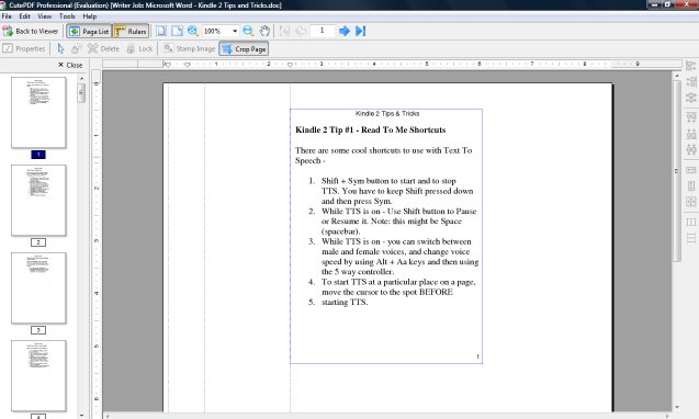I copy and pasted the text into a Word Document. I set the page size to 4.5 inches by 5.75 inches. I added a header and page numbers (just because I could). I also used hard page breaks to get each tip on its own page (unless it was very short and then I'd put 2 on a page). The font was TimesNew Roman at 12pts. First I tried running the Word file the MPC but wasn't happy with the results, so I decided to use PDFRead after creating a PDF file with CutePDF Pro 3.6 (the free version) using the same page dimension (4.5 inches by 5.75 inches). I've been using this software for years but never explored all the features available even in the free version. The results were a pages sized to fit my Kindle but with a huge white border around it. I used the advanced crop tools to create a rectangle around the text on the first page that would be big enough to work for all pages in the PDF. Having that page number at the bottom of the page helped me to make the correct size rectangle. I now had a PDF with a very small border (there is a watermark at the bottom of the first page only which covers the page number - hey, for free what do you want). I ran that PDF through PDFRead and got a nice sized and very readable pdf. Edit: As I play more, it looks like this works best with PDFs you create yourself to fit a 6 inch screen. I'm not having much luck with PDFs created previously for 8.5 and 11 in pages (I'm still trying the script PDF in the first post to work). Last edited by daffy4u; 03-24-2009 at 10:53 PM. |