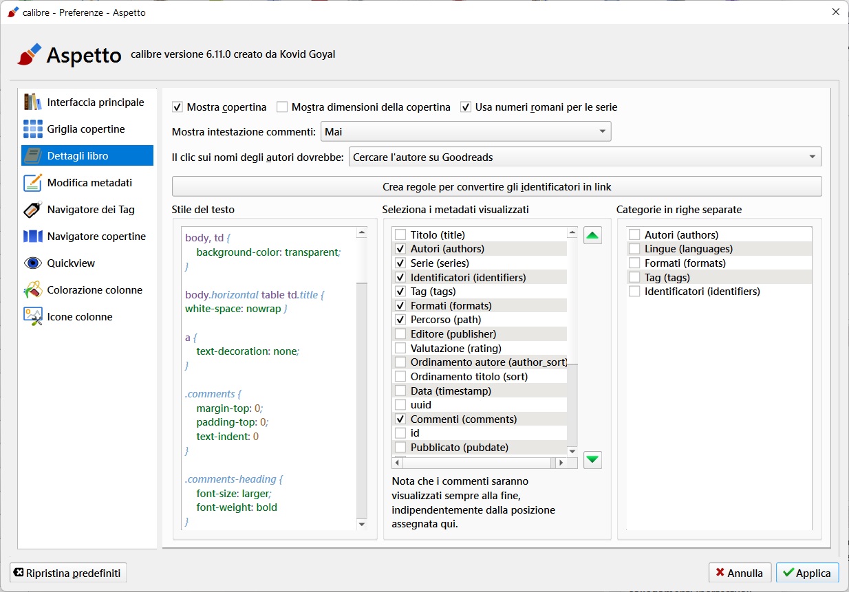 after I upgraded Calibre to version 6.16, the lines I entered in Preferences => Look & feel => Book details disappeared and, if I re-enter them, they disappear every time, see fig.1 and fig.2. Can anyone tell me why? Thanks and bye |