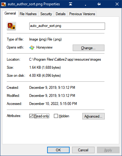 When I tried, ProcMon shows Calibre attempting a CreateFile operation and getting 'ACCESS DENIED' result. But on a non-readonly file, the CreateFile is successful: Last edited by ownedbycats; 12-11-2022 at 02:09 AM. |