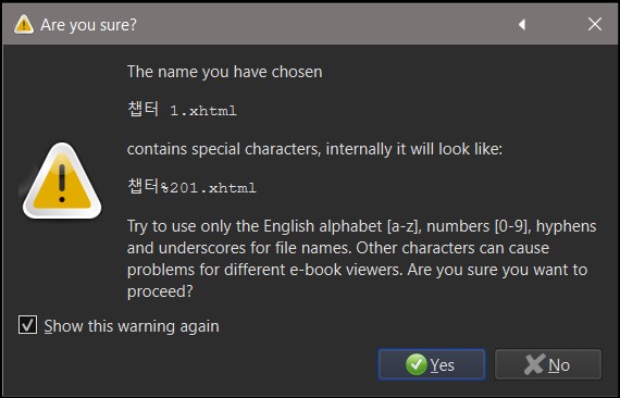 If I change a file name, within an epub, from start.xhtml to 챕터 1.xhtml then the calibre book editor issues the following warning message: FTR: Sigil issues a similar message If I click Yes to "Are you sure" the file name is changed, viz: @tatagi - what language setting do you have for your OS, calibre, and the book - mine are all English BR |