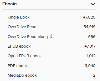 Checking another library, there are 188 epub and 121 kindle new fiction arrivals.