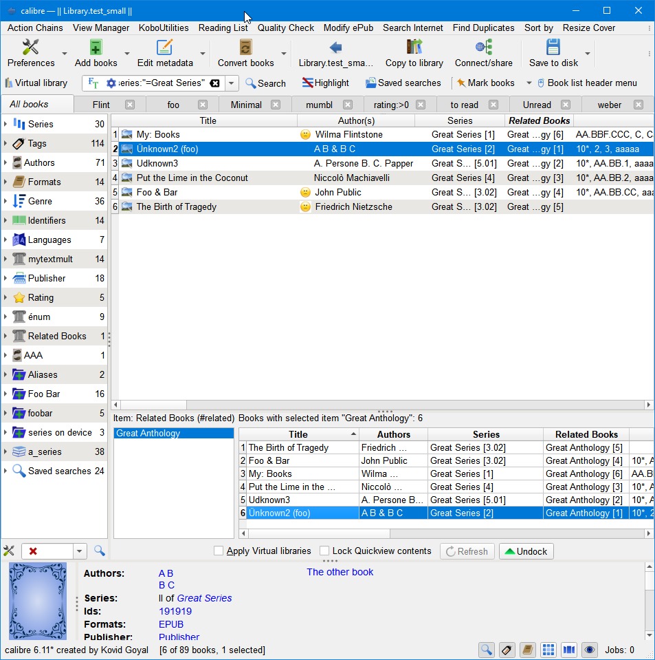 Mine started out as a place for pseudonyms (some of my dead tree volumes had those and later, the e-book was released with the real name). The I started using it for Anthology Author lists Turns out that column serve both purposes. (It also allowed for a short name for my first, file name based readers bookshelf) I also use Preferences: searching: grouped searches to use both together for some searches. My general plan priority for {Authors}: 1) The Editors (on the cover) if shown eg. Gardner Dozios (ed) [and yes, I add the (ed) if 'Edited by' is what is on the cover.] 2) A (perceived) Headliner Author (usually the first on the cover or largest print) 3) <various> Mostly for Boxed sets with no clear 'Editor'. Is this the only way? nope. Does it fail on edge cases ![]() YMMV |