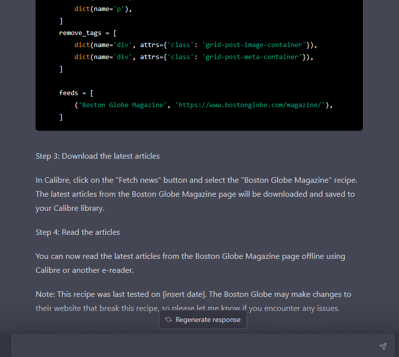 I think it just came up with the keep_only_tags based on code from available recipes.. but it some how searched for actual rss feeds and placed them into the code instead of making them up. fengli .. don't add that code to the recipe created by chatGPT! add it to the built-in recipe. |