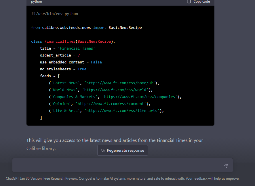 I think it just came up with the keep_only_tags based on code from available recipes.. but it some how searched for actual rss feeds and placed them into the code instead of making them up. fengli .. don't add that code to the recipe created by chatGPT! add it to the built-in recipe. |