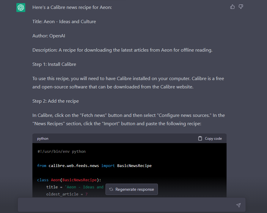I think it just came up with the keep_only_tags based on code from available recipes.. but it some how searched for actual rss feeds and placed them into the code instead of making them up. fengli .. don't add that code to the recipe created by chatGPT! add it to the built-in recipe. |