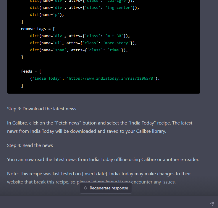 I think it just came up with the keep_only_tags based on code from available recipes.. but it some how searched for actual rss feeds and placed them into the code instead of making them up. fengli .. don't add that code to the recipe created by chatGPT! add it to the built-in recipe. |