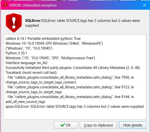 Anyways, so far so good on the get custom columns button, NO error popups and the log says all good in attach, so it seems to be working All of the test libraries show up, with their custom columns.Here's the log, in case I missed something: susan@localhost:~> calibre-debug --gui calibre 6.11 embedded-python: False Linux-6.1.8-1-default-x86_64-with-glibc2.36 Linux ('64bit', 'ELF') ('Linux', '6.1.8-1-default', '#1 SMP PREEMPT_DYNAMIC Tue Jan 24 06:29:25 UTC 2023 (baebfe0)') Python 3.10.9 Interface language: None Successfully initialized third party plugins: Consolidate All Library Metadata (2, 0, 45) && Job Spy (1, 0, 202) && MultiColumnSearch (1, 0, 96) && View Manager (1, 10, 2) QPA platform: xcb devicePixelRatio: 1.0 logicalDpi: 96.0 x 96.0 physicalDpi: 102.23899371069182 x 102.35820895522387 ApplicationPaletteChange event ignored Using calibre Qt style: True [0.00] Starting up... [0.00] Showing splash screen... [0.03] splash screen shown [0.03] Initializing db... [0.04] db initialized [0.04] Constructing main UI... Screens currently in system: {'depth': 24, 'device_pixel_ratio': 1.0, 'geometry_in_logical_pixels': {'height': 1080, 'width': 1920, 'x': 0, 'y': 0}, 'index_in_screens_list': 0, 'manufacturer': 'ViewSonic Corporation', 'model': 'VX2250 SERIES', 'name': 'DVI-I-1', 'serial': 'RWS102406078-', 'size_in_logical_pixels': {'height': 1080, 'width': 1920}, 'virtual_geometry': {'height': 1080, 'width': 1920, 'x': 0, 'y': 0}} Restoring geometry for: calibre_main_window_geometry {'frame_geometry': {'height': 1036, 'width': 1920, 'x': 0, 'y': 0}, 'full_screened': False, 'geometry': {'height': 1005, 'width': 1920, 'x': 0, 'y': 31}, 'maximized': True, 'normal_geometry': {'height': 1005, 'width': 1920, 'x': 0, 'y': 31}, 'screen': {'depth': 24, 'device_pixel_ratio': 1.0, 'geometry_in_logical_pixels': {'height': 1080, 'width': 1920, 'x': 0, 'y': 0}, 'index_in_screens_list': 0, 'manufacturer': 'ViewSonic Corporation', 'model': 'VX2250 SERIES', 'name': 'DVI-I-1', 'serial': 'RWS102406078-', 'size_in_logical_pixels': {'height': 1080, 'width': 1920}, 'virtual_geometry': {'height': 1080, 'width': 1920, 'x': 0, 'y': 0}}} Matching screen: {'depth': 24, 'device_pixel_ratio': 1.0, 'geometry_in_logical_pixels': {'height': 1080, 'width': 1920, 'x': 0, 'y': 0}, 'index_in_screens_list': 0, 'manufacturer': 'ViewSonic Corporation', 'model': 'VX2250 SERIES', 'name': 'DVI-I-1', 'serial': 'RWS102406078-', 'size_in_logical_pixels': {'height': 1080, 'width': 1920}, 'virtual_geometry': {'height': 1080, 'width': 1920, 'x': 0, 'y': 0}} Setting widget geometry to: {'height': 1005, 'width': 1920, 'x': 0, 'y': 31} Restoring widget to maximized CALM: initialization_complete............ Job Spy has begun initialization... Calibre, and hence Job Spy, was gracefully shut down last time? True Last time daemon started: never Last time daemon failed: never Total daemon starts inception_to_date: 0 Total daemon failures inception-to-date: 0 qt.gui.imageio: libpng warning: iCCP: known incorrect sRGB profile JS: ===>>> change_gui_alternating_row_colors() Job Spy has finished initialization... [0] un-optimized number of undesirable characters accumulated: 756 [1] optimized number of undesirable characters accumulated: 596 MCS has finished initialization... [1.60] main UI initialized... [1.60] Hiding splash screen Starting QuickView [1.75] splash screen hidden [1.75] Started up in 1.75 seconds with 467 books CALM_DB_VERSION_METADATA_DB 2 CALM_DB_VERSION_METADATA_TOOLS_DB 2 CALM_DB_VERSION_UPGRADE_FORCE_UPGRADE False CALM_DB_VERSION_UPGRADE_SUPPRESS_INFO_DIALOGS False CALM_FORCE_RECONSOLIDATION False CALM_LAST_CONSOLIDATION_JOB_DATETIME ...NEVER... CALM_LAST_CONSOLIDATION_NUMBER_BOOKS 0 CALM_LAST_CONSOLIDATION_NUMBER_LIBRARIES 0 CALM_LAST_CONSOLIDATION_TARGET_DB_FULL_PATH ZZ: CALM_MCS_INDEX_CONSOLIDATION False CALM_TARGET_DB_FULL_PATH /home/susan/Calibre/CALM/metadata.db CALM_TARGET_DB_GENERATING_NONCALM_LIBRARY_PATH ZZ:||>>>||ZZ: CALM_TARGET_DB_LAST_CHOSEN_LIBRARY_DIRECTORY ZZ: CALM_TARGET_DB_MUST_BE_REFRESHED False CALM_TARGET_PARENT_DIRECTORY /home/susan/Calibre CALM_USER_STATUS USER Number of keys in self.mysourceprefs in 'load_source_prefs_init' : 128 Number of keys in self.mysourceprefs in 'load_source_prefs' : 128 my_db.library_path: /home/susan/Calibre/LanguageandWriting self.target_db: /home/susan/Calibre/CALM/metadata.db filesystem_encoding is: utf-8 filesystem_encoding is: utf-8 Attaching to Tools DB: /home/susan/Calibre/CALM/metadata_tools.db n_tools_size = os.path.getsize(tools_path): 2260992 Number of keys in self.myparentprefs in 'child_invocation_of_save_real_prefs_parent' : 128 LIBRARY_PATH_03 : /home/susan/Calibre/LanguageandWriting LIBRARY_PATH_04 : /home/susan/Calibre/New Library LIBRARY_PATH_05 : /home/susan/Calibre/NewBooksForCalibre LIBRARY_PATH_06 : /home/susan/Calibre/Testlibrary number_source_libraries: 4 n_last_to_show: 6 n_tools_size = os.path.getsize(tools_path): 2260992 filesystem_encoding is: utf-8 metadata_tools.db is good to go. CALM_DB_VERSION_METADATA_DB 2 CALM_DB_VERSION_METADATA_TOOLS_DB 2 CALM_DB_VERSION_UPGRADE_FORCE_UPGRADE False CALM_DB_VERSION_UPGRADE_SUPPRESS_INFO_DIALOGS False CALM_FORCE_RECONSOLIDATION False CALM_LAST_CONSOLIDATION_JOB_DATETIME ...NEVER... CALM_LAST_CONSOLIDATION_NUMBER_BOOKS 0 CALM_LAST_CONSOLIDATION_NUMBER_LIBRARIES 0 CALM_LAST_CONSOLIDATION_TARGET_DB_FULL_PATH ZZ: CALM_MCS_INDEX_CONSOLIDATION False CALM_TARGET_DB_FULL_PATH /home/susan/Calibre/CALM/metadata.db CALM_TARGET_DB_GENERATING_NONCALM_LIBRARY_PATH ZZ:||>>>||ZZ: CALM_TARGET_DB_LAST_CHOSEN_LIBRARY_DIRECTORY ZZ: CALM_TARGET_DB_MUST_BE_REFRESHED False CALM_TARGET_PARENT_DIRECTORY /home/susan/Calibre CALM_USER_STATUS USER Number of keys in self.mysourceprefs in 'load_source_prefs_init' : 128 Number of keys in self.mysourceprefs in 'load_source_prefs' : 128 my_db.library_path: /home/susan/Calibre/LanguageandWriting self.target_db: /home/susan/Calibre/CALM/metadata.db Number of keys in self.mysourceprefs in 'save_sour