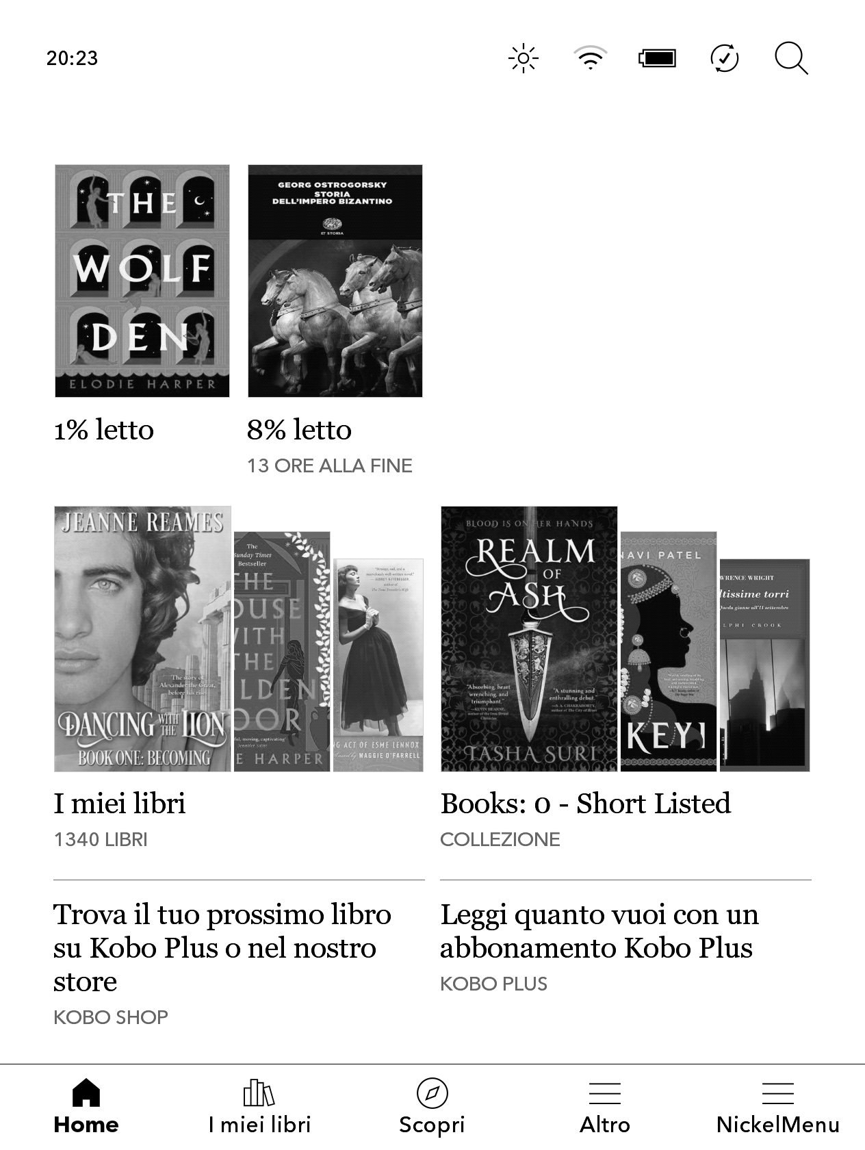1) Home layout can't be changed (afaik). You basically have the top row with the books you are reading, then a section under that links to your books (on the left), and to the last collection/series/author you opened (on the right). Below that you have two links to the Kobo shop page and the other does change showing different Kobo services (once it linked to something else, but I can't remember, tbh lol) The footer has quick access to your library, your services over wifi (Shop, Overdrive, Dropbox if it's supported for your device/country), the menu (Altro) to access the configuration for the device, and finally NickelMenu is not something out-of-the-box, but it's a very nice tool you can install and that allows you to access to functionality not available by default on your device (Dropbox for Libra, for example), or to enable in a more quick way functionalities that are available but that requires multiple taps or to play around with the config file (screenshots, custom screensavers if you don't want to display the cover of the book you are reading and so on) That's all for library management, I think (as you can see, I use as subtitles the # of pages that the Count Page plugin gives me) ![]() And yes, collections can be whatever you want (one or more calibre columns, regular or custom ones), and you can change them whenever you want because the driver has a nice option to delete empty collections The only limitation I'm aware of is that if you want to use wifi and sync if you have a lot of collections (70+), the sync process can get struck. |