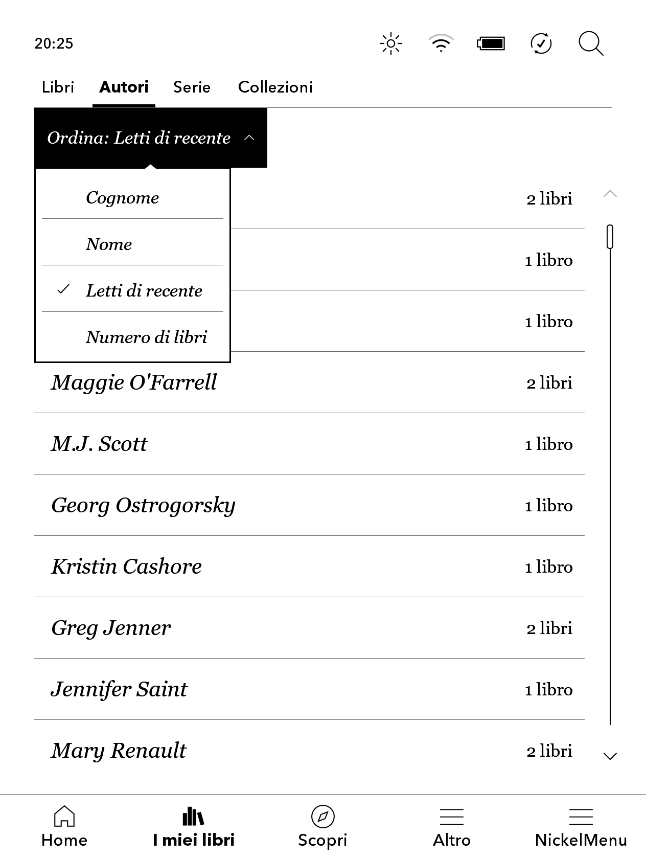 1) Home layout can't be changed (afaik). You basically have the top row with the books you are reading, then a section under that links to your books (on the left), and to the last collection/series/author you opened (on the right). Below that you have two links to the Kobo shop page and the other does change showing different Kobo services (once it linked to something else, but I can't remember, tbh lol) The footer has quick access to your library, your services over wifi (Shop, Overdrive, Dropbox if it's supported for your device/country), the menu (Altro) to access the configuration for the device, and finally NickelMenu is not something out-of-the-box, but it's a very nice tool you can install and that allows you to access to functionality not available by default on your device (Dropbox for Libra, for example), or to enable in a more quick way functionalities that are available but that requires multiple taps or to play around with the config file (screenshots, custom screensavers if you don't want to display the cover of the book you are reading and so on) That's all for library management, I think (as you can see, I use as subtitles the # of pages that the Count Page plugin gives me) ![]() And yes, collections can be whatever you want (one or more calibre columns, regular or custom ones), and you can change them whenever you want because the driver has a nice option to delete empty collections The only limitation I'm aware of is that if you want to use wifi and sync if you have a lot of collections (70+), the sync process can get struck. |