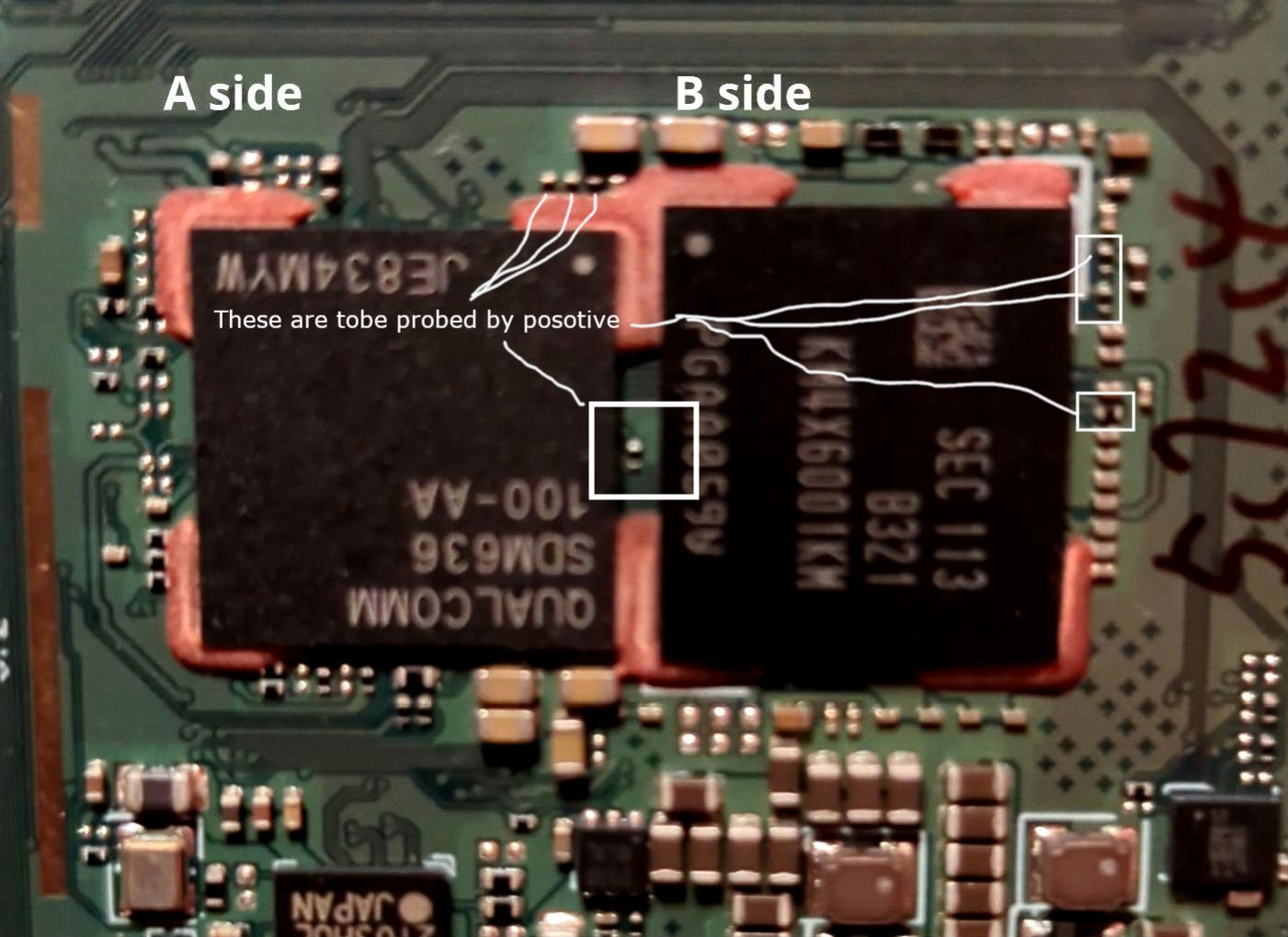 Ok, now we embark for the darkest shores. The concept is that if you can prevent your SoC from accessing the flash memory it will say, "I give up. There's nothing here, I'm in a wasteland, I'm going to 9008." You are interested in the teeny-tiny black rectangles. The brown/blondish are of no importance. In this diagram there aren't a lot of useful possibilities. Try not to short them, connect to one side or the other. Use the voltmeter in diode test with the black lead connected to tin. Do a long power button reset and look for 9008. Prepare accordingly by downloading edl.exe, Zadig and the Firehose loader on that page. It may be difficult to hit 9008 and you want to be prepared. |