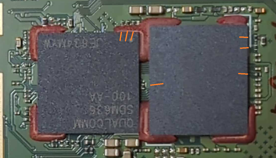 Ok, now we embark for the darkest shores. The concept is that if you can prevent your SoC from accessing the flash memory it will say, "I give up. There's nothing here, I'm in a wasteland, I'm going to 9008." You are interested in the teeny-tiny black rectangles. The brown/blondish are of no importance. In this diagram there aren't a lot of useful possibilities. Try not to short them, connect to one side or the other. Use the voltmeter in diode test with the black lead connected to tin. Do a long power button reset and look for 9008. Prepare accordingly by downloading edl.exe, Zadig and the Firehose loader on that page. It may be difficult to hit 9008 and you want to be prepared. |