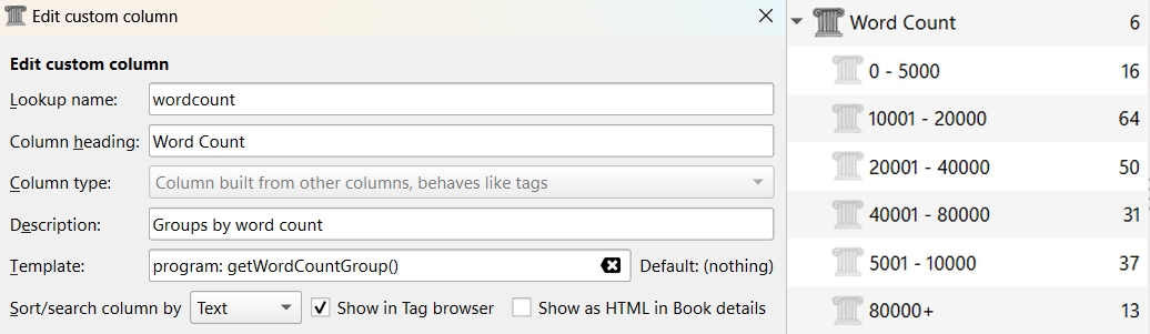 Hello! I made a template function to group word counts by certain thresholds and used it for a custom column where the results are shown on the tag browser, but they're not being sorted properly on the tag browser. It seems to only see the first digit on 5000, 10000, etc. The custom columns are already sorted by text. Same case for tags with numbers though I'm not sure if that's the intended behavior.