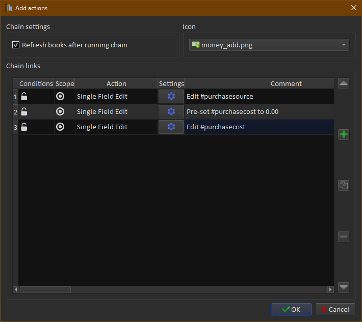 I have "add purchase information" as a chain, but also use chain caller to run it as part of my general cleanup chain. However, not all books need purchase information (public domain, game manuals, etc), or sometimes I run it after adding the info so skipping the last two steps saves a bit of time.