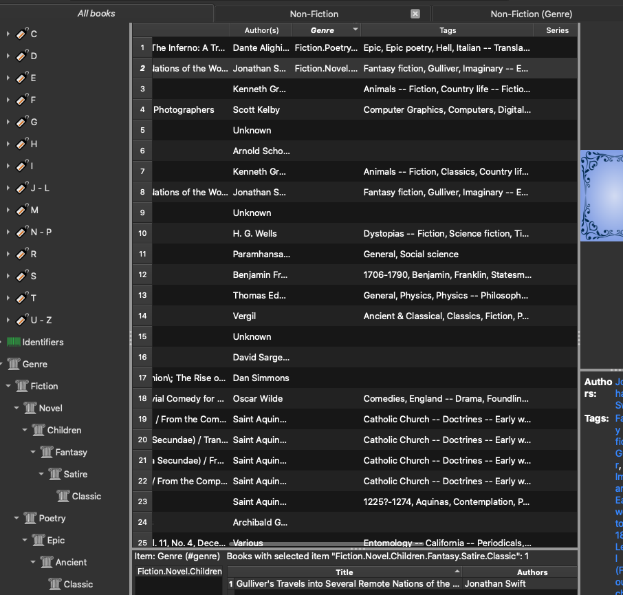I am trying to better understand the Calibre design behind the virtual libraries and tags. 1) Is it possible to nest virtual libraries within each other, creating a hierarchy of tiered virtual libraries within a single, shared virtual library? For example, if I begin with one main root virtual library entitled Non-Fiction, could I then create sub-libraries within it: 1) History; 2) Science; 3) Philosophy; 4) etc? 2) Am I correct in my understanding that tags cannot be nested within each other? Do tags all exist on the same hierarchical level? 3) Are tags considered metadata? Is there a find-and-replace command within Calibre that might help me better manage the metadata -- including automated tags that I would like to reword (often resulting from Calibre's metadata searches)? 4) Does anyone have any overall comments or suggestions for best practices in setting up detailed virtual libraries and customized tags? I am especially interested in defining tags for genres in a way that can be organized into tiers, if that is possible. Thanks for your help! |