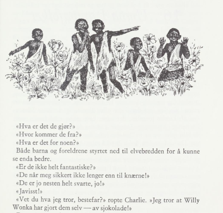 I think that's a good change. The parallel to historic chattel slavery in the original is not great, to put it mildly. I find it troubling that the Norwegian translations have kept the original version, where Wonka literally says that he has imported them from Africa! (The newest version I found online is from 2000, so it's possible it has been updated since then. That version has illustrations showing them as white, but text describing them as black, so that's probably a bit confusing for readers.) |