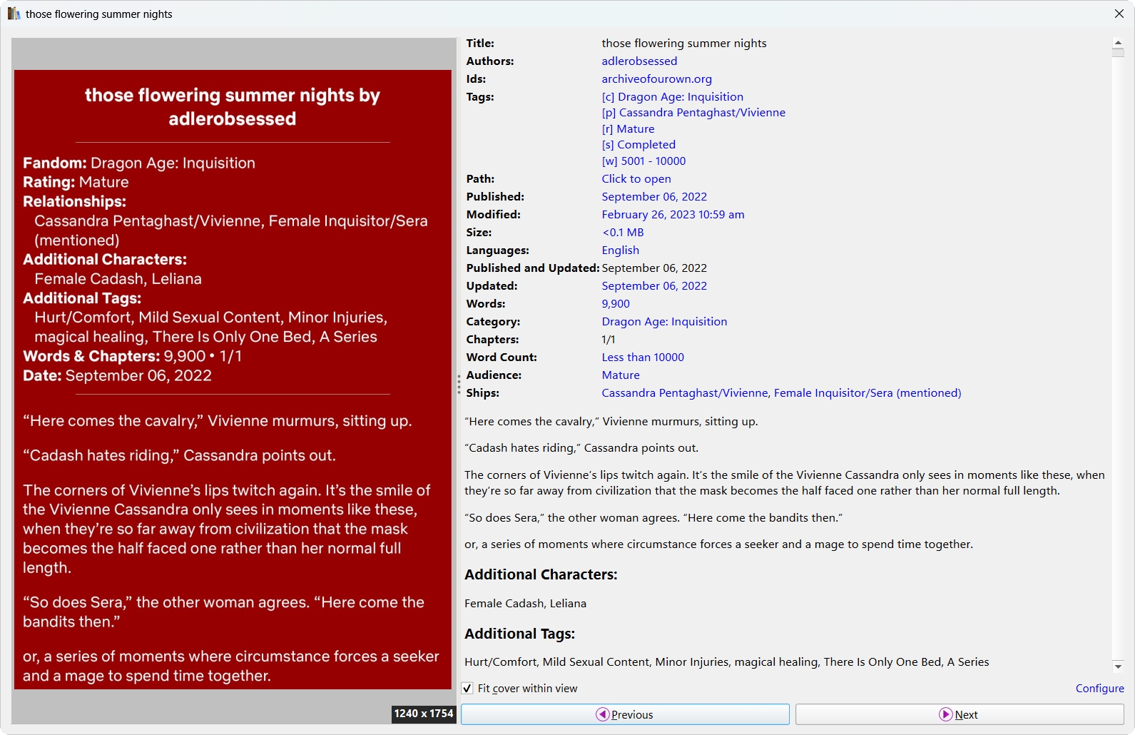 If I want to look up the freeform tags on Calibre, I can still search for them since they're in a custom column with the long text type. I use MapleRead to read epubs and I want to see the tags by order of their type so I also put a prefix depending on the tag. If it's a category it's [c], for the relationships it's [p], rating [r], status [s], grouped word count [w]. How I add the prefixes: Spoiler: