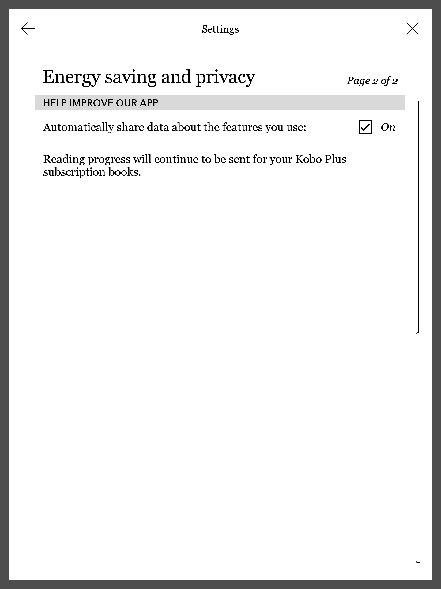 If you want to disable that information, you can go to the second page of Energy Saving and Privacy in the Settings and remove the check mark from Automatically share data about the features you use. This does have the warning that reading progress will still be sent for Kobo Plus books. |