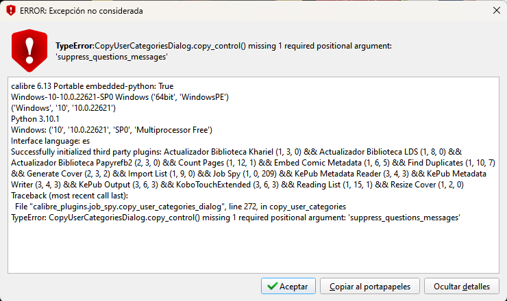 I was using the Enhancements to GUI Tool 'Copy User Category to Target Library' and it got some errors. - If I try to copy only one category, doing it in the usual way, I get the error that corresponds to the image "Error 1" - If I try to use the tool from any library other than my main library, I get the error that corresponds to the image "Error 2" This same error occurs even from a clean installation of Calibre. Job Spy's settings are by default. For some reason it only works from my main library, and only new options, checkbox checked or not. Some of my libraries have different structures, but it also doesn't work on libraries that have the same structure as the main one. Sorry, as a beta tester I suck