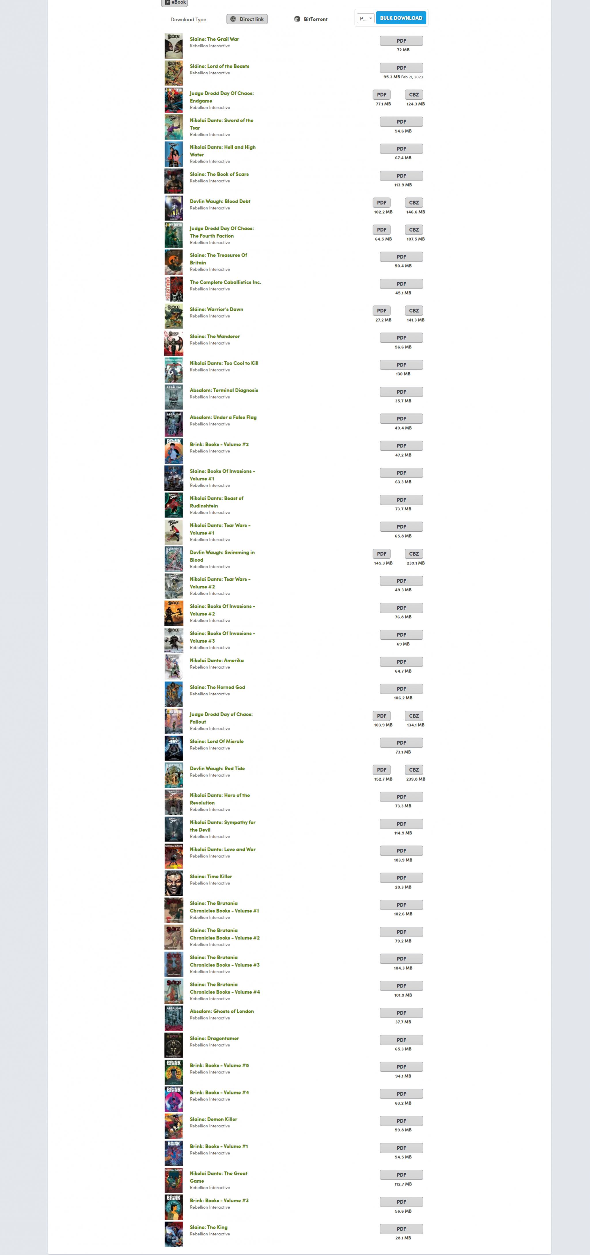 https://www.humblebundle.com/books/2...ebellion-books I'm very tempted to go in just for the Slaine comics. One thing I can't figure out though is whether they all offer CBZs, or just some. The sidebar says "PDF and CBZ", but it seems like when clicking on the individual books, only Slaine: Warrior's Dawn is showing CBZ as an option. |
