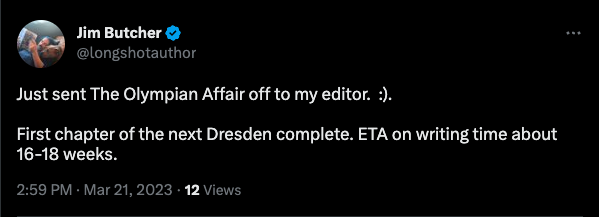 Thank you. That does sound like the next Dresden Files is not coming out until 2024 if Cinder Spires comes out later this year (around September?).