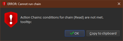 calibre, version 6.13.0 ERROR: Cannot run chain: Action Chains: conditions for chain (Read) are not met. tooltip: Last edited by ownedbycats; 03-05-2023 at 07:59 PM. |