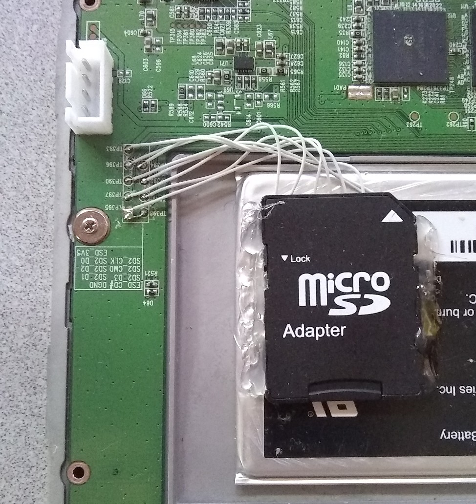 I used a full-size SD card adapter as a socket. You could also solder directly to a micro SD if you never intend to use it elsewhere. The wire is 30 AWG (0.05 mm²) solid "wire wrap" wire. See: http://www.temblast.com/blogs/glow4/blog.htm |