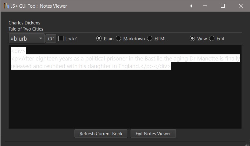 Version 1.0.216 -2023-03-14 Notes Viewer: Many major changes to the user experience, including tabbing and alt+letter shortcuts specific to the tool. The tool does not use your personal Calibre shortcuts, just its own. Look for the underlined letter in the various widgets.